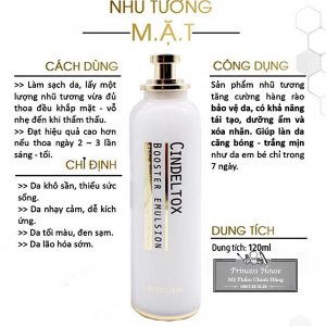 - Nhũ tương Dưỡng Trắng Cindel Tox Booster Emulsion 120ml Korea là giải pháp phục hồi và tái sinh làn da tự nhiên. Tăng hiệu quả dưỡng trắng da gấp 3-4 lần khi sử dụng chung với kem truyền trắng Cindel Tox.